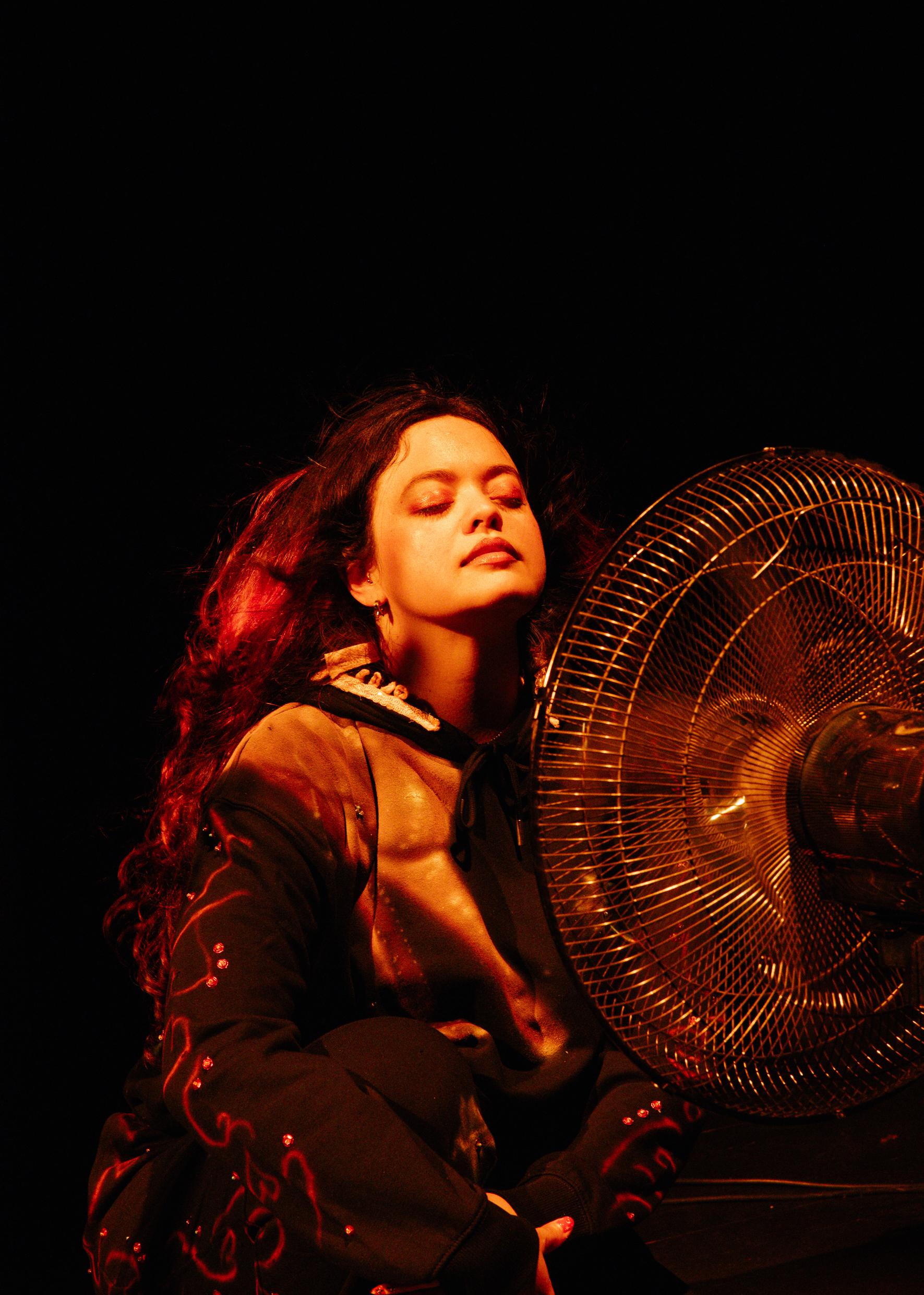artistic direction, concept, dramaturgy and performance Mayara Yamada ⎸ guest performer Frederico Araujo ⎸ collaboration on theory, dramaturgy and stage direction Caio Riscado ⎸ original music Ágatha Barbosa – Cigarra ⎸ stage manager and artistic collaboration Luca Frati ⎸ outside eye Julie Marmet ⎸ technical, lighting design and scenography technique Jean Sottas | sound design and video mapping Fabien Vigna ⎸ video creation Ali-Eddine Abdelkhalek and Mayara Yamada | video editing and mapping Ali-Eddine Abdelkhalek ⎸ video shooting Adrianna Oliveira, Ali-Eddine Abdelkhalek, Alice Oechslin, Igor Teixeira Amaral, Mayara Yamada ⎸ costumes and accessories Yumi Ikeda Ferretti ⎸ makeup Sofia Borges ⎸ administration, executive production Julie Marmet, ARROI - production production Vision Nocturne / Night Vision ⎸ co-production La Bâtie – Festival de Genève, Arsenic - Centre d’art scénique contemporain, L'Abri - Genève, Kaserne Basel ⎸ residencies Kaserne Basel, L’Abri - Genève, Maison Des arts du Grütli, Porteous, LABo Artes Performativas, Maison Saint Gervais ⎸ institutional partner LABo Artes Performativas et BRECHA Criações