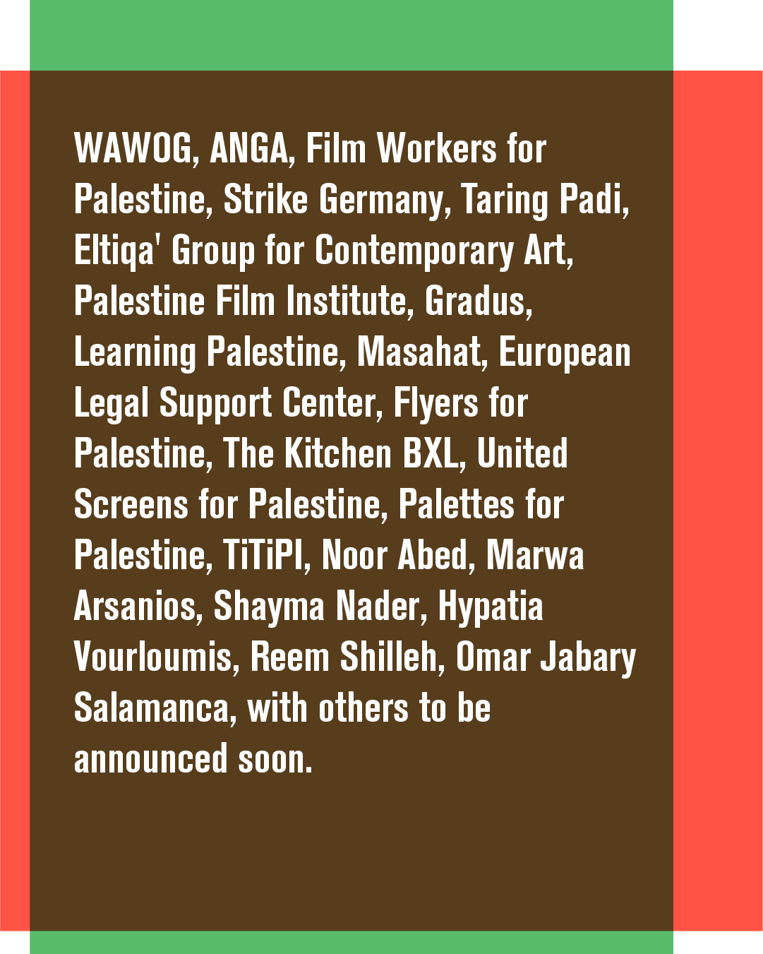 Participant·e·s et facilitateur·ice·s: WAWOG, ANGA, Film Workers for Palestine, Strike Germany, Taring Padi, Eltiqa' Group for Contemporary Art, Palestine Film Institute, Gradus, Learning Palestine, Masahat, Palestine Music Expo [PMX], European Legal Support Center, Flyers for Palestine, The Kitchen BXL, United Screens for Palestine, Palettes for Palestine, TiTiPI, Noor Abed, Marwa Arsanios, Shayma Nader, Hypatia Vourloumis, Reem Shilleh, Omar Jabary Salamanca, et et d'autres qui seront annoncés bientôt.