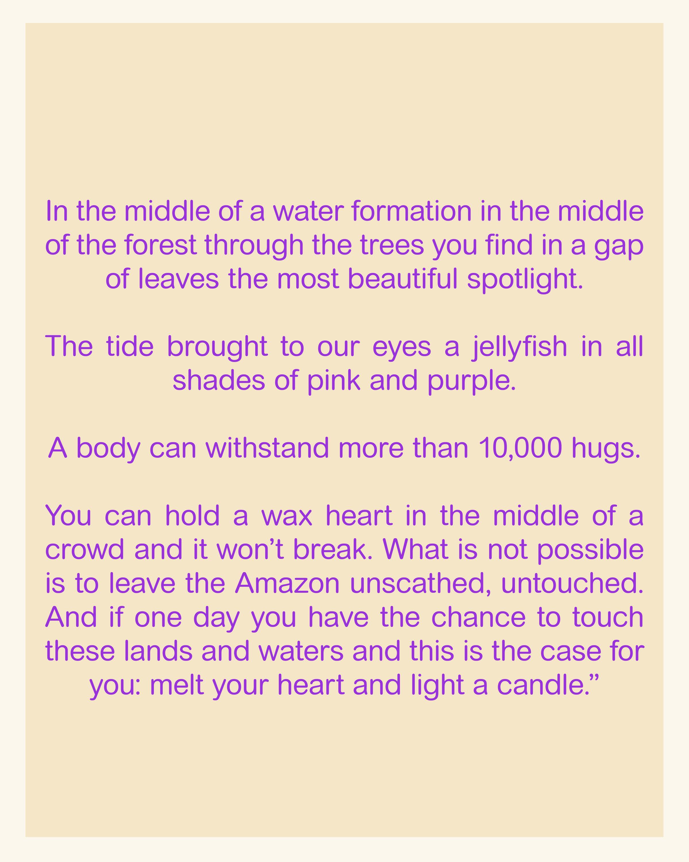 É possível segurar um coração de cera no meio de uma multidão e ele não quebrar. O que não é possível é sair ileso da Amazônia, intocado. E se um dia lhes for permitido tocar essas terras e essas águas e esse for o caso de vocês: derretam o seu coração e acendam uma vela.