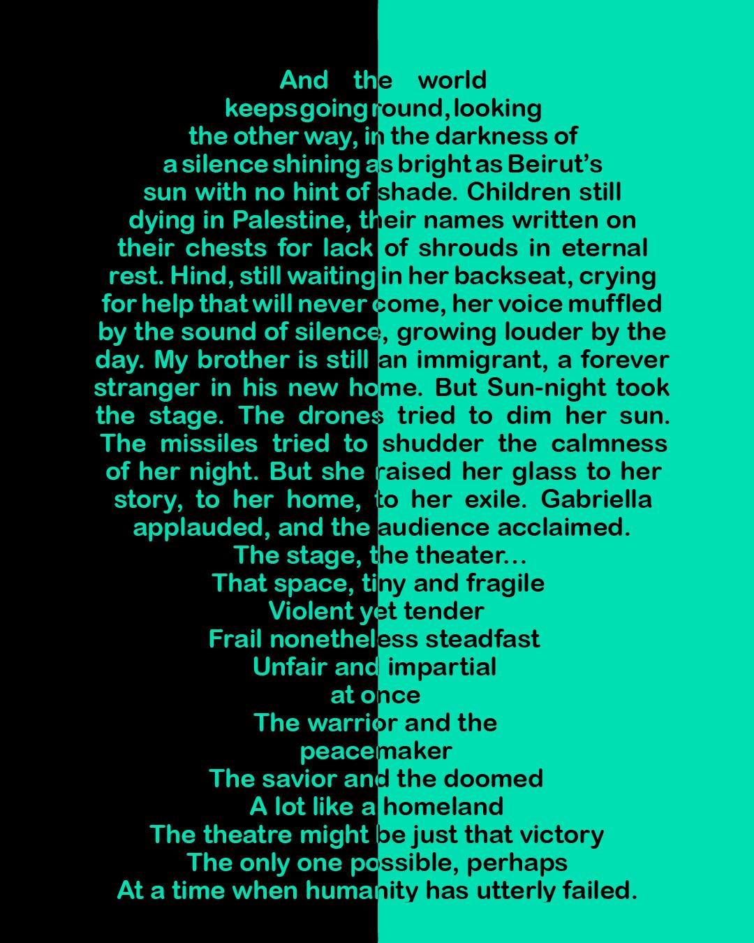 But Sun-night took the stage. The drones tried to dim her sun. The missiles tried to shudder the calmness of her night. But she raised her glass to her story, to her home, to her exile.