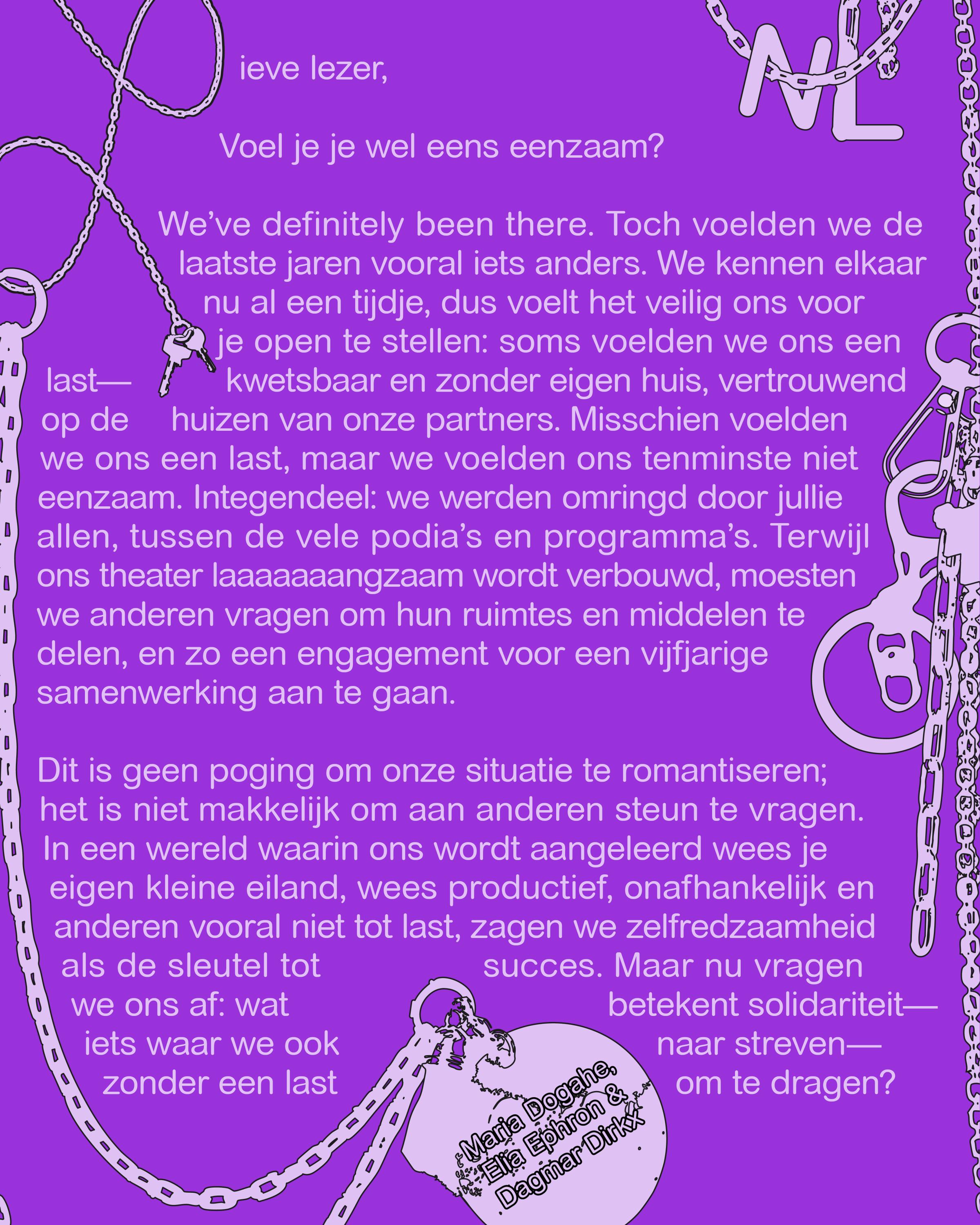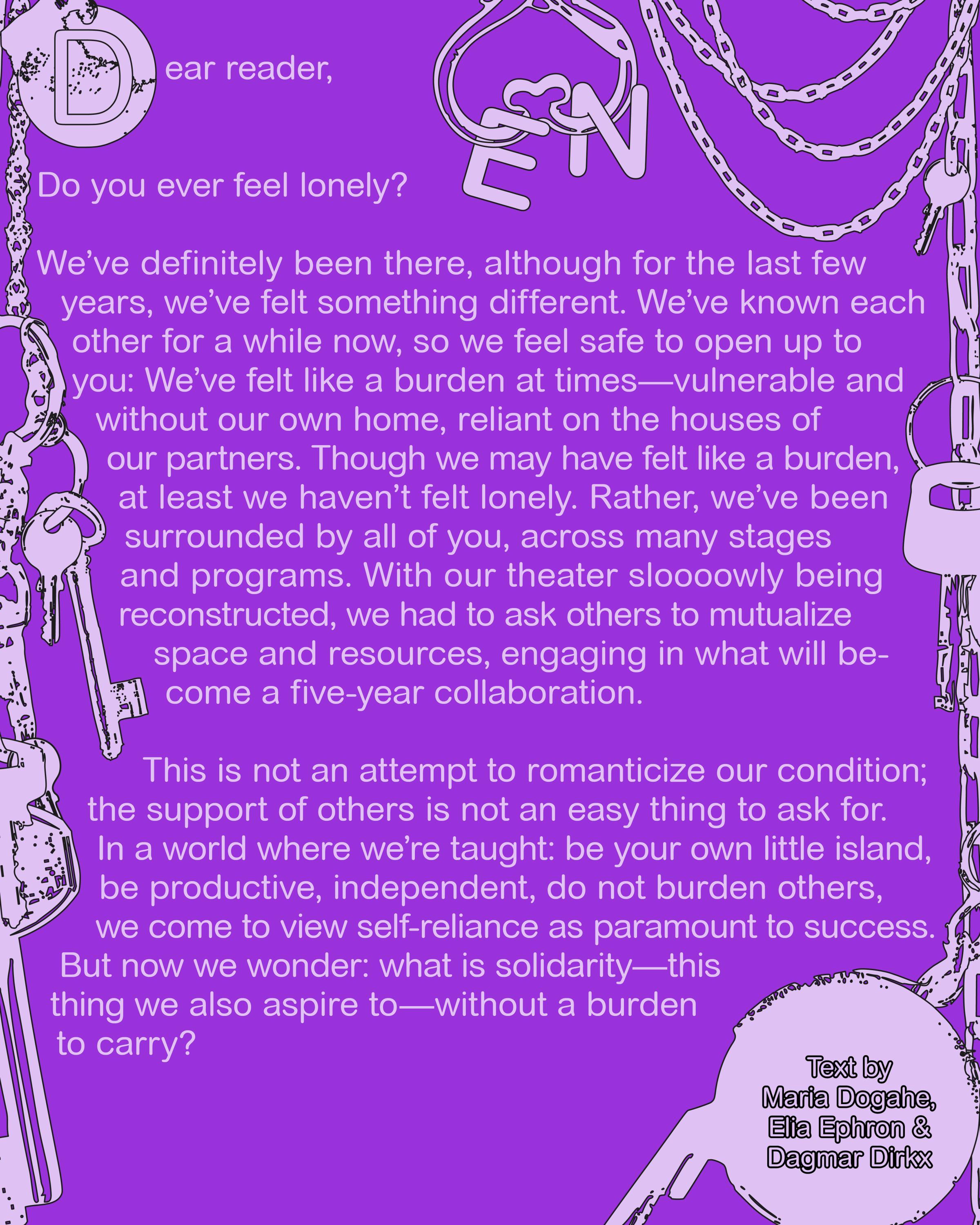 Dit is geen poging om onze situatie te romantiseren; het is niet makkelijk om aan anderen steun te vragen. In een wereld waarin ons wordt aangeleerd: wees je eigen kleine eiland, wees productief, onafhankelijk en anderen vooral niet tot last, zagen we zelfredzaamheid als de sleutel tot succes. Maar nu vragen we ons af: wat betekent solidariteit—iets waar we ook naar streven—zonder een last om te dragen?