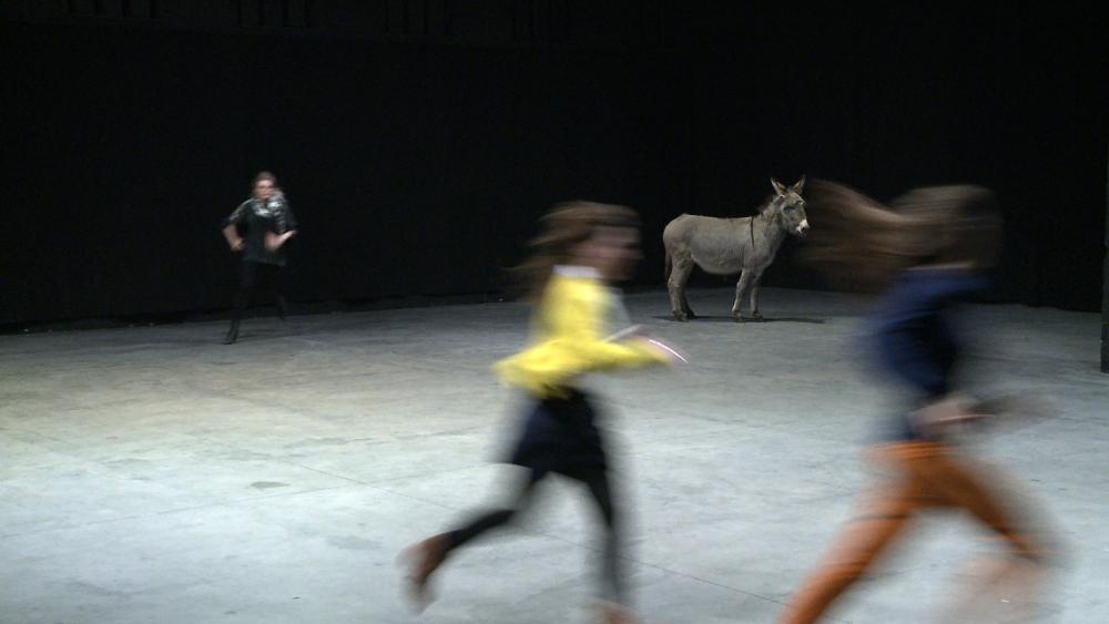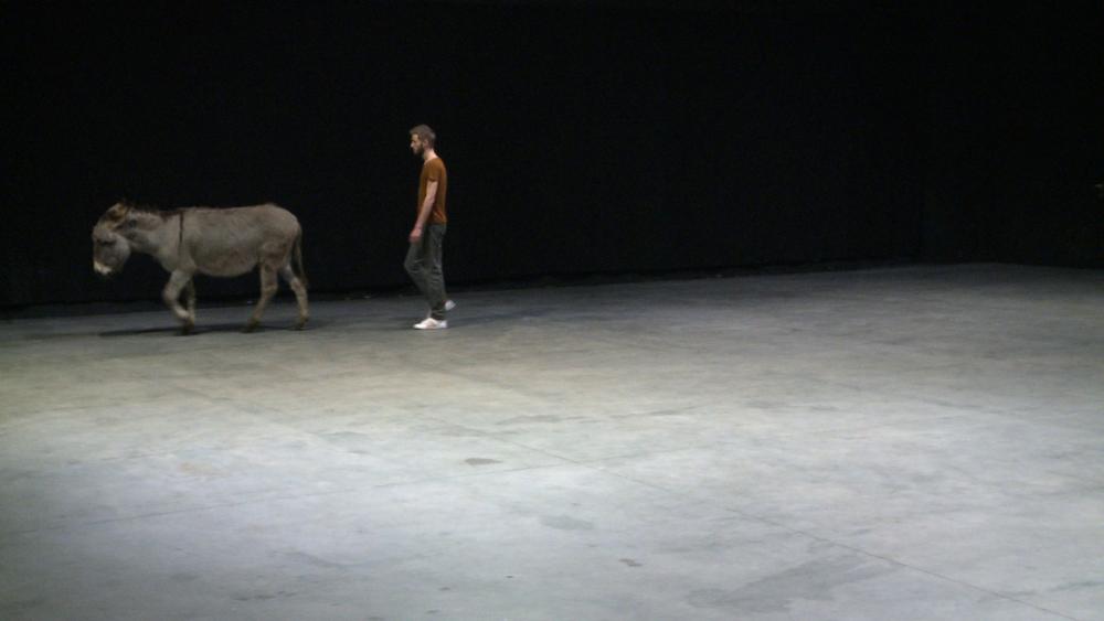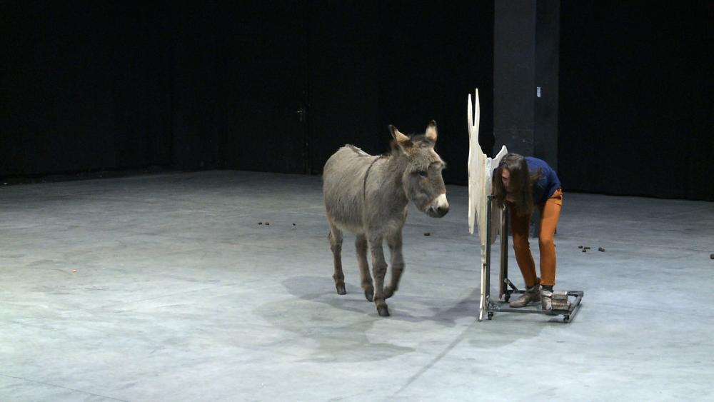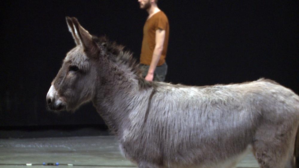 BALTHAZAR is a longterm artistic research project by David Weber-Krebs (director) and Maximilian Haas (dramaturgy/theory) that explores our cultural relationship with animals using the means of theater. The performances show an encounter of one animal and a group of human performers on a stage. A donkey – Balthazar – is the protagonist, the centre of the action.