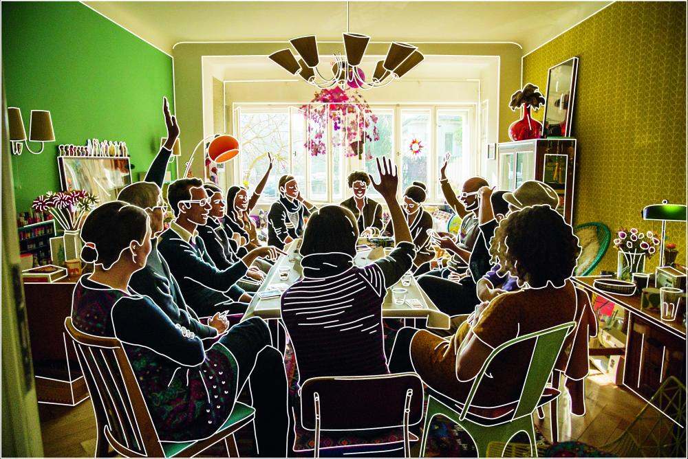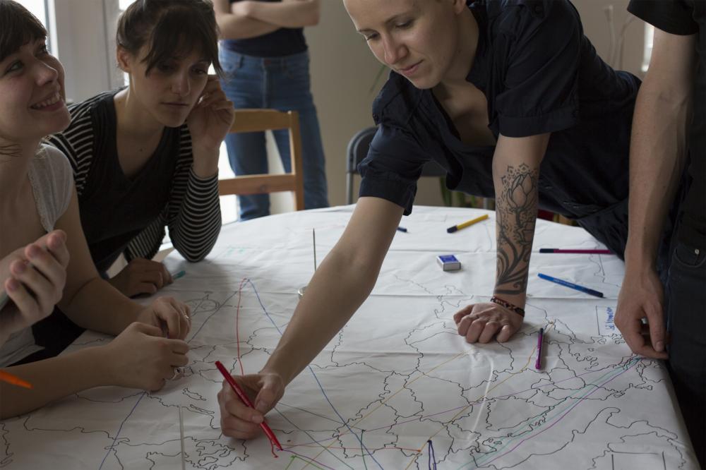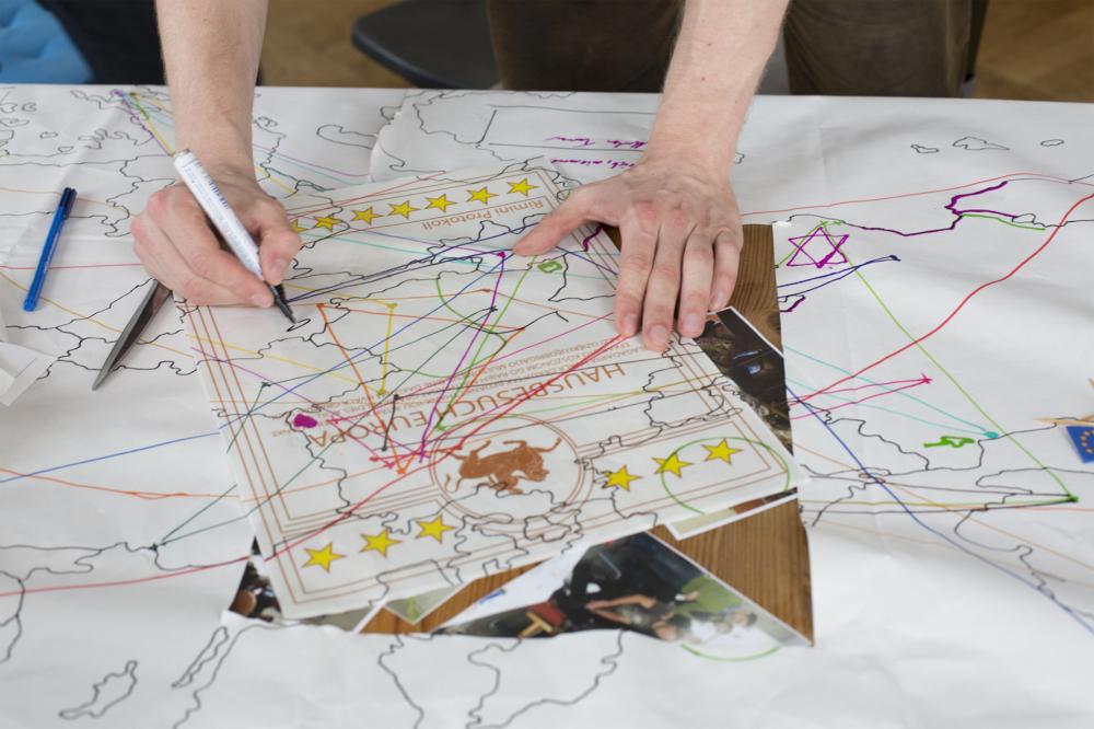 In Home Visit Europe, the Berlin-based theatre collective Rimini Protokoll juxtaposes the rather abstract idea of a European federation with the individual nature of a private home. 15 spectators – or are they participants? – sit at a table in the living room of a private home. The entire performance is contained in a suitcase and is laid out on the table. What initially resembles a political gathering quickly becomes a game as maps are unfolded, a soundtrack gradually becomes audible in the background, problems need to be solved, and joint decisions need to be made. Personal stories and parliamentary rituals are woven together, with participants zigzagging from country to country, from citizen to citizen, and criss-crossing the entire continent.