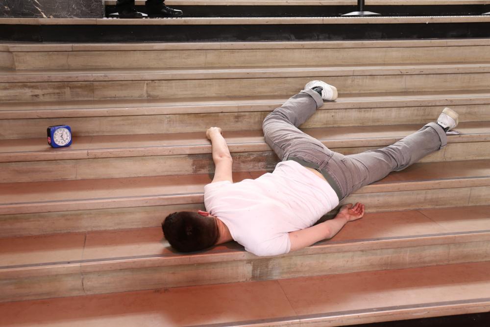 We get up and we go back to sleep every day: the two extremes that determine the primal unity of our lives. In this performance, River Lin questions sleep as an artificial force. To ritualize the daily cycle, he tries to fall asleep in an unexpected public place. Until his alarm wakes him, over and over again.