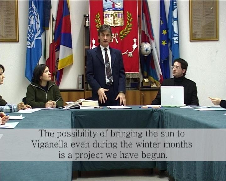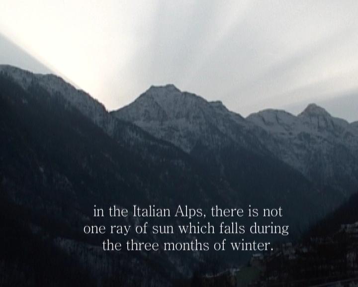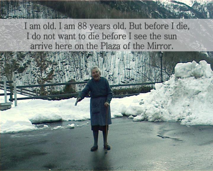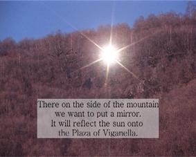 ![]() | Maria Thereza Alves - The Sun (video) Viganella is a village in a deep valley in the Italian Alps. From mid-November to early February it does not see the sun at all. So its two hundred inhabitants came up with an idea: a computer-controlled 8 by 5 metre mirror high on a south-facing slope reflects the rays of the sun into the village. |