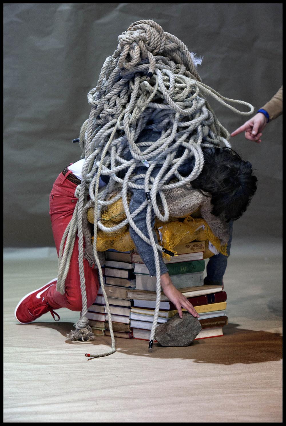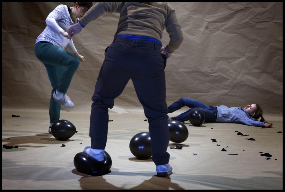 Untried Untested is an experimental room with bodies and other objects. The performers carry out candid examinations on the objects, themselves and each other. The naïvety of their experiments masks a determination to discover new relations, ranging from the subtle to the violent. WIthout words, this space relies on tactility and observation - a meditation on materiality.