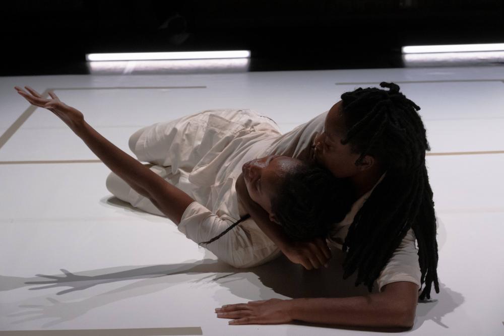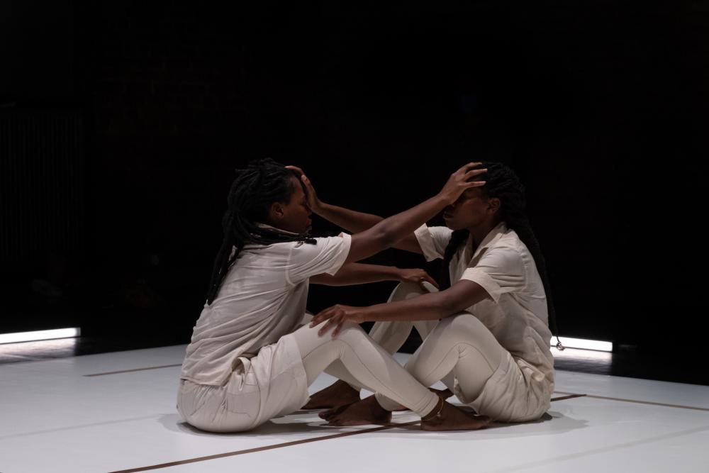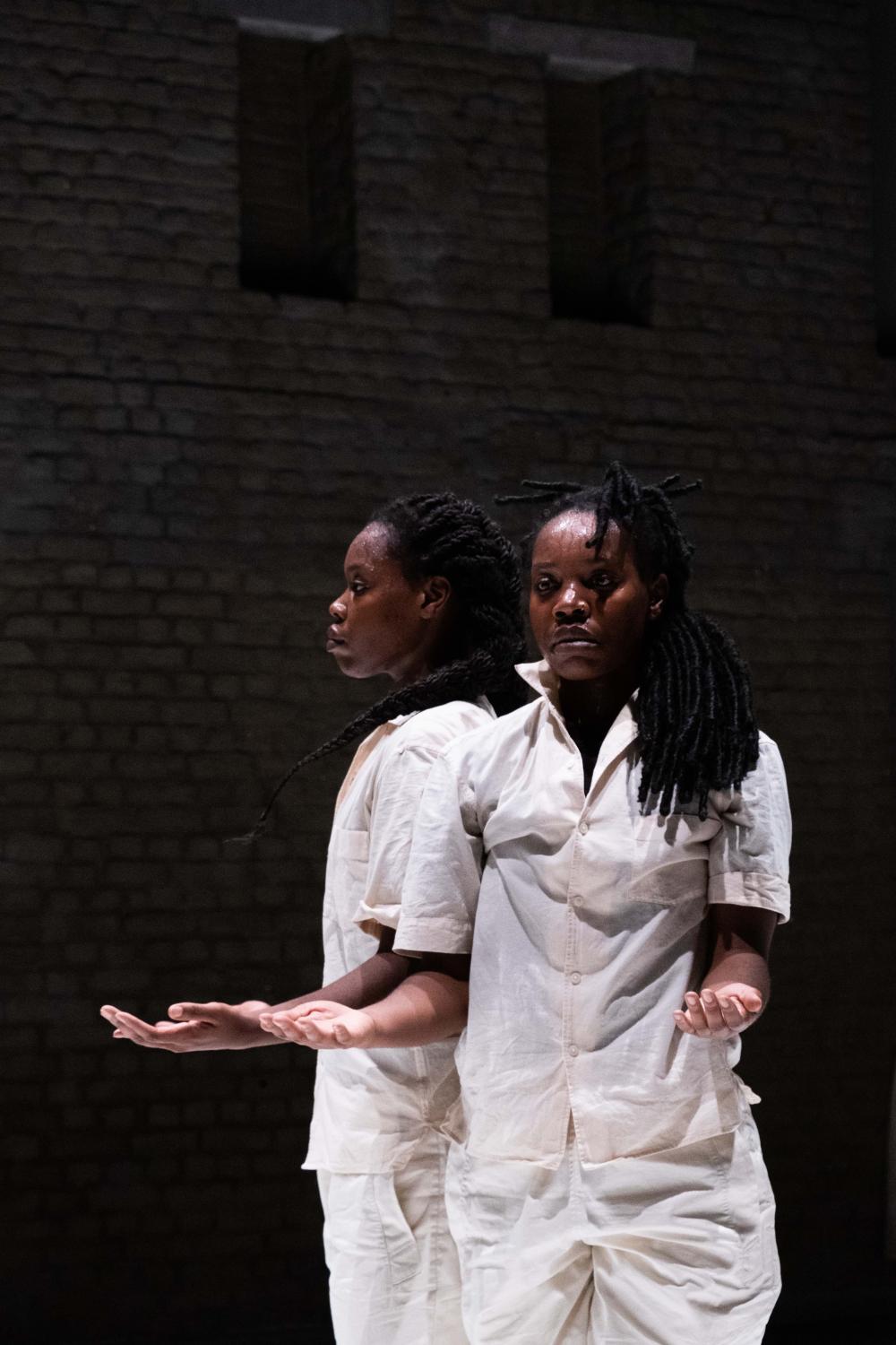Deux performeuses, d’apparence identique se meuvent à travers l’espace théâtral. La scénographie évoque le « Bungalow tropical », une structure résidentielle installée par les coloniaux au Congo et subdivisée selon le principe de « zoning » : la ségrégation stricte des espaces de circulation pour blancs (les résidents coloniaux) et pour noirs (le personnel domestique local).