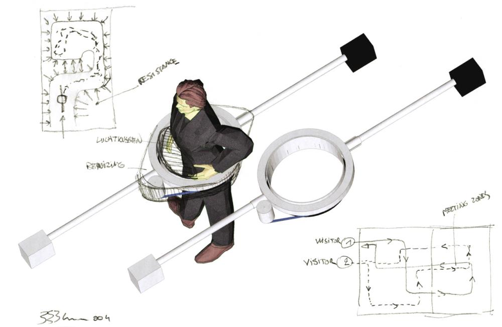 In Compass (2005) gespt de bezoeker een ‘oriëntatiemachine’ om zijn middel. De machine leidt hem doorheen een virtueel parcours. De toeschouwer verkent de ruimte en ontdekt een tastbare maar immateriële architectuur. Hij kan de machine volgen of zich tegen de machine verzetten.