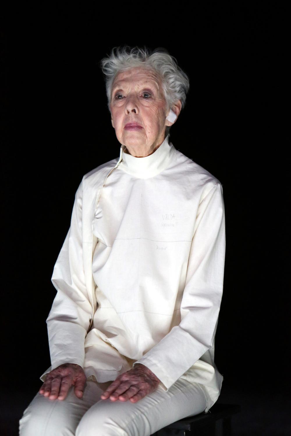 artistic direction Eszter Salamon | concept, dramaturgy Eszter Salamon, Christophe Wavelet | realisation, performance Valda Setterfield, Gus Solomons Jr. | technical direction, light Rima Ben Brahim | costumes Three armholes jackets and trousers signed by haut couture designer Adeline André | puppets Gus Solomons Jr. | production Sandra Orain, Elodie Perrin / Studio E.S., Alexandra Wellensiek / Botschaft Gbr | organization Elodie Perrin | transcription Simon Pleasance, Richard Gray, Samir Sellami, Verena Kutschera, Gabriella Docherty | co-production LE CND, un centre d’art pour la danse, HAU Hebbel am Ufer (Berlin), Internationales Sommerfestival Kampnagel (Hamburg), PACT Zollverein (Essen), Tanzquartier (Wien) | support Regional Director for Cultural Affairs in Paris – The French Ministry of Culture and Communication, Département de la Seine-Saint-Denis, Institut Français à Paris FUSED, Fondation Dar al-Ma’mûn, PARADIGM, Nanterre-Amandiers | funding National Performance Network (NPN), Coproduction Fund for Dance supported by the Federal Government Commissioner for Culture and Media on the basis of a resolution passed by the German Bundestag | thanks to French Institute Alliance Française, Julie Harrington, Nanterre-Amandiers | Eszter Salamon is Associated Artist at CND
