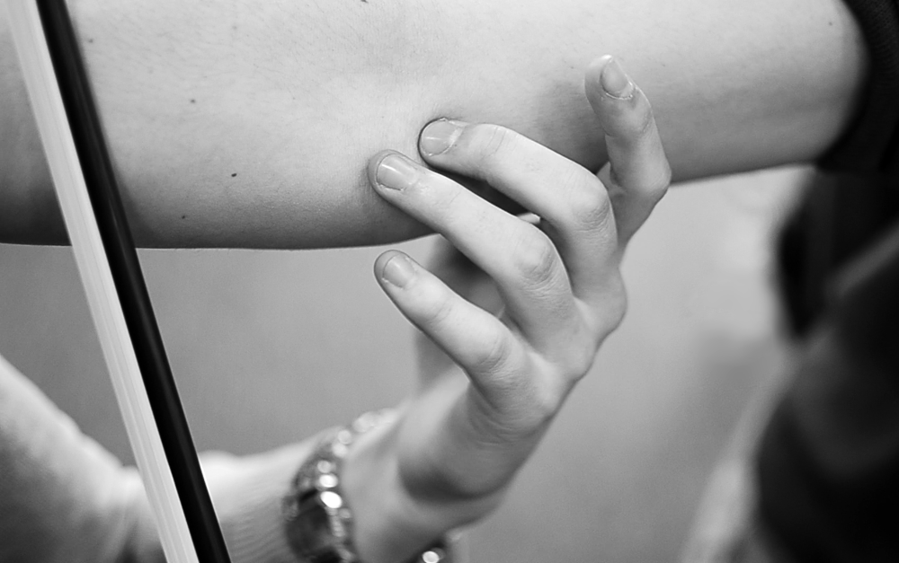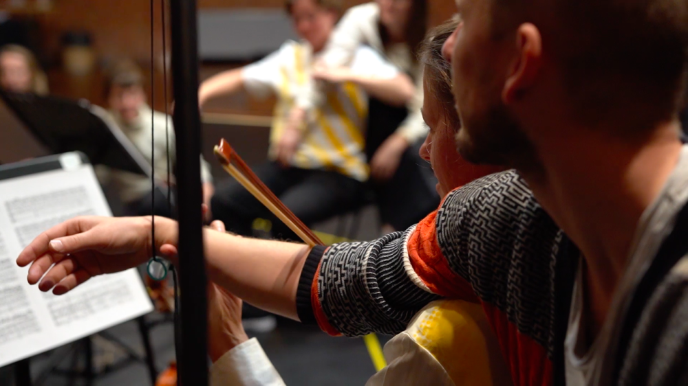De vier muzikanten spelen passages uit diverse kwartetten, van Franz Schubert en Florence Price tot hedendaagse werken van Georg Friedrich Haas, Michael Picknett en Caroline Shaw. Ondertussen wagen ze zich aan één-op-één aanrakingen met het publiek, waardoor een fysiek tegenspel ontstaat. Alles vloeit voort uit aanraking – een strijkstok op een snaar, een arm op een schouder, een akoestische gewaarwording op je huid. De dansers bemiddelen de ontmoeting tussen muzikaliteit en tastzin, hun choreografie slingert heen en weer tussen voelen, zien en horen. Op het punt waar de banen van dans en muziek elkaar kruisen, word je uitgenodigd om binnen te treden in de caleidoscopische partituur. Geef een hand of arm!