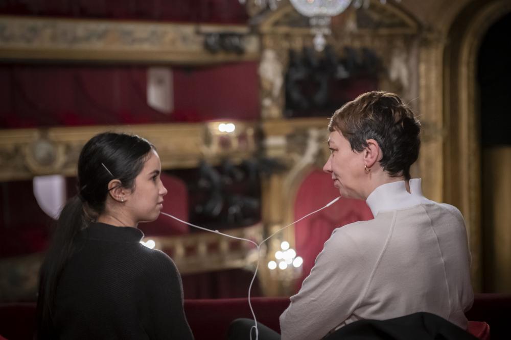 Een voorstelling waarin elke tiener een toeschouwer begeleidt langs een vooraf opgenomen dialoog, en de woorden herhaalt die via een oortje worden ingefluisterd.